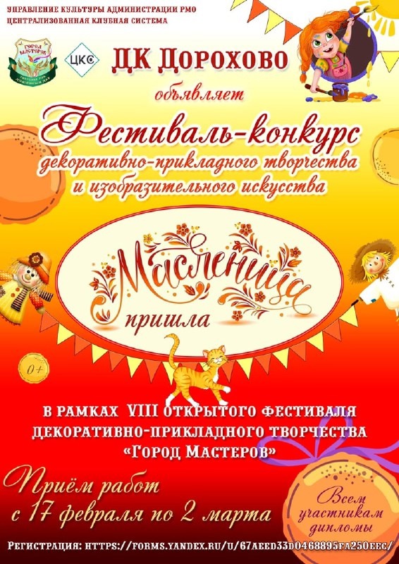 Дом культуры Дорохово приглашает всех желающих на открытый фестиваль-конкурс декоративно-прикладного творчества и изобразительного искусства «Масленица пришла!