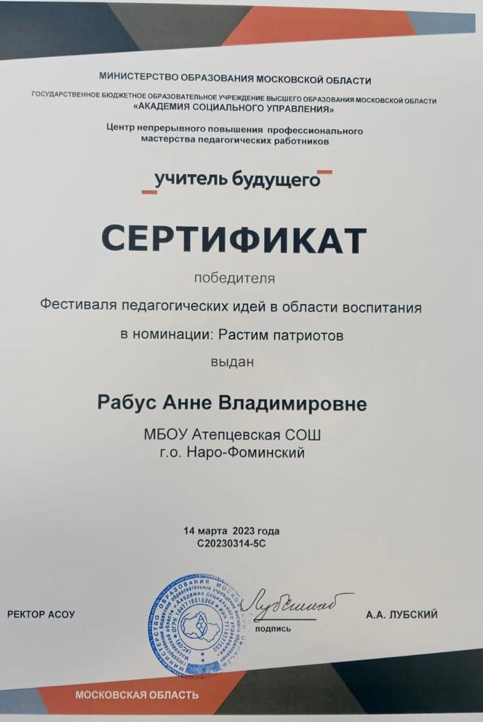 Поздравляем победителей Фестиваля Павицкую Елену Васильевну — учителя географии Наро-Фоминской школы для учащихся с ограниченными возможностями здоровья в номинации «Личностное и профессиональное развитие» и Рабус Анну Владимировну — учителя начальных классов Атепцевской школы в номинации «Растим патриотов».