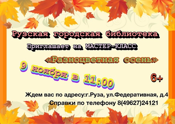 9 ноября в студии нетрадиционной техники рисования «Цветные ступеньки» Рузской городской библиотеки пройдет мастер-класс «Разноцветная осень». Начало в 11 часов.