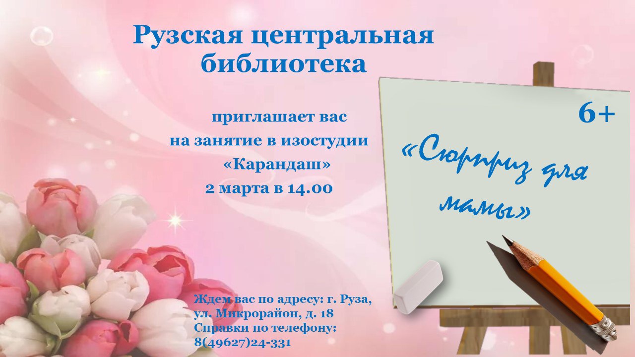 2 марта в 14 часов в изостудии «Карандаш» Рузской центральной библиотеки состоится занятие «Сюрприз для мамы», посвященное Международному женскому дню 8 Марта.