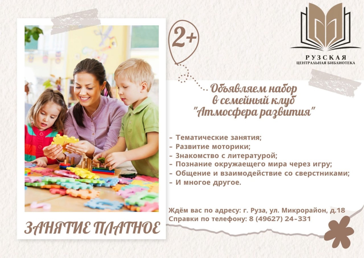 Рузская центральная библиотека рада объявить набор в семейный клуб "Атмосфера развития"