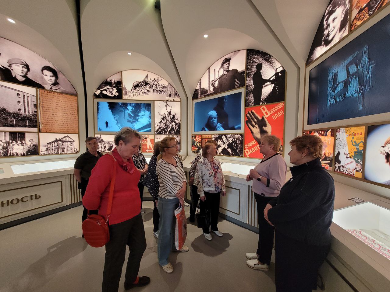 Пенсионеры с интересом и трепетом обошли несколько залов: «Страна молодых», где рассказывает о предвоенном времени и как жила в то время молодёжь; «Учебный класс» – инсталляцию учебного класса московской школы 1930-х годов; зал, посвященный подвигу Зои Космодемьянской; землянка, оснащенная новейшими мульмедийными технологиями; «Стена героев».