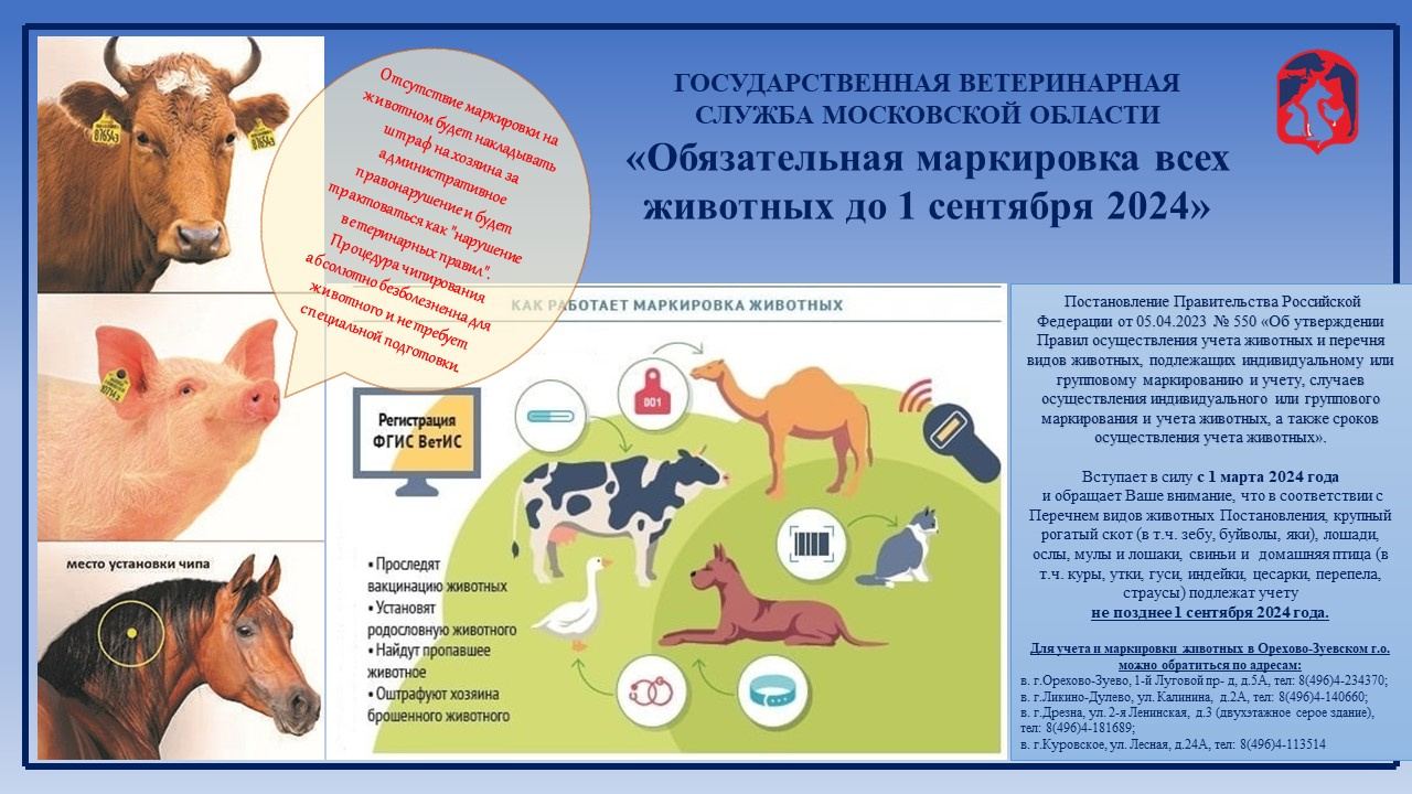 Сотрудники ветеринарной станции Орехово-Зуевского округа информируют жителей о том, что домашняя птица, крупный рогатый скот, лошади, свиньи и другие животные подлежат учёту — подробности смотрите в инфографике.