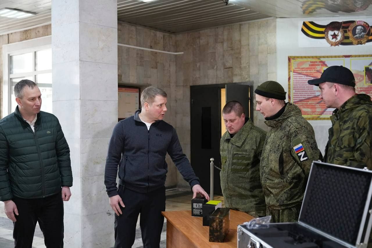 «Ребята, мы сегодня по вашему наказу передаем это имущество. Надеемся, что оно вам за линией пригодится, будете им пользоваться. Все, что вы хотели, здесь есть – это антидроновые ружья, тепловизоры, тактические наушники, которые защищают от контузии, и многое другое», – сказал зампред.