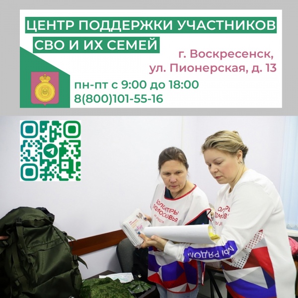 Напоминаем, что Центр поддержки участников СВО и их семей располагается по адресу: г. Воскресенск, ул. Пионерская, дом 13 (вход с торца дома, со стороны комплекса «Вечный огонь»). Действует горячая линия – 8(800)101-55-16 и телеграм-чат t.me/vos_mob . Часы работы: понедельник-пятница с 9.00 до 18.00.
