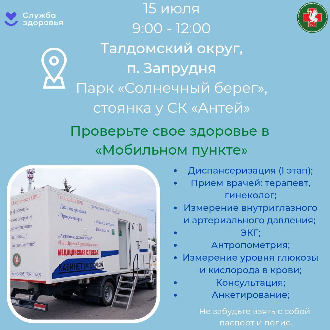 Передвижной «Мобильный пункт» Талдомской больницы будет работать в субботу, 15 июля, с 9:00 до 12:00, в п. Запрудне, рядом с парком «Солнечный берег».