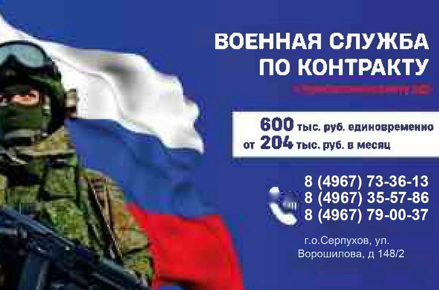 Также для желающих заключить контракт можно обратиться в военный комиссариат городских округов Серпухов, Пущино и Протвино по адресу: г. Серпухов, ул. Ворошилова д. 148/2. Телефоны для справок: +7 (49-67) 35-57-86, +7 (4967) 79-00-37.