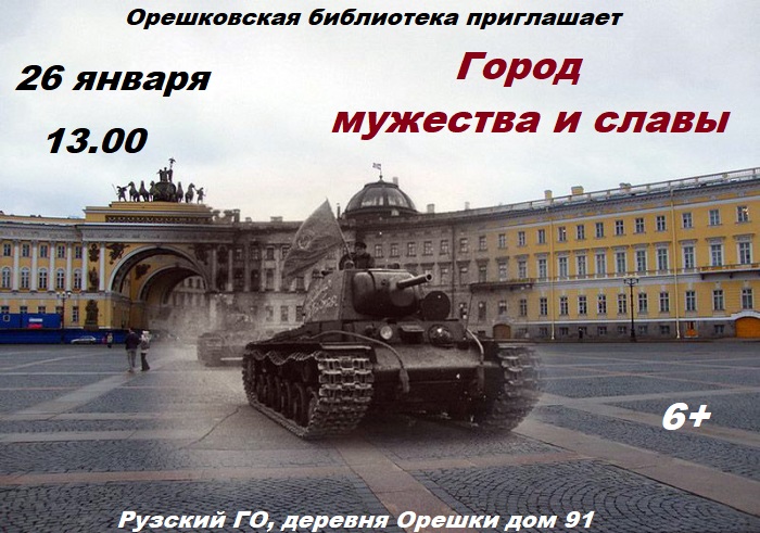 26 января в 13 часов в Орешковской сельской библиотеке Рузского городского округа состоится час мужества «Город мужества и славы», посвященный 80-летию снятия блокады Ленинграда.