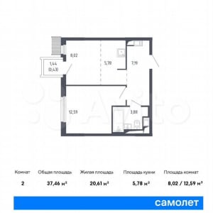 - Общая площадь: 37.5 м²