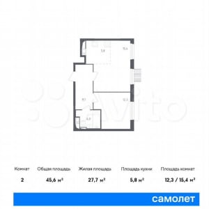 - Общая площадь: 45.6 м²