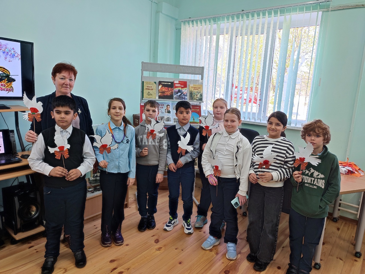 Библиотекарь рассказала ребятам о главных символах победы в Великой Отечественной войне. А затем предложила изготовить поделку к празднику.